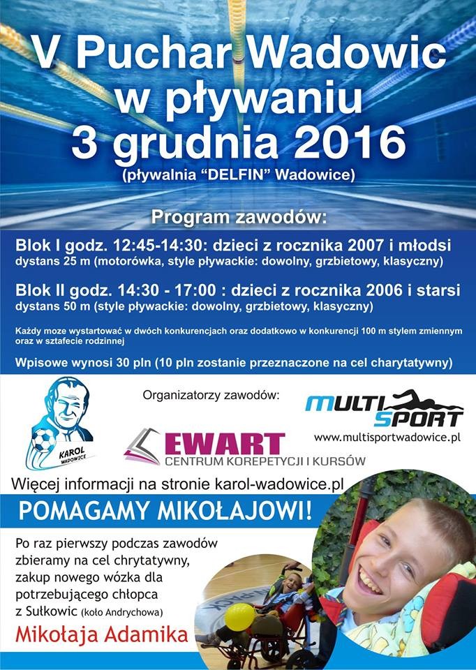 3 grudnia PUKS Karol Wadowice zaprasza wszystkich miłośników sportu pływackiego, do udziału w zawodach o V Puchar Wadowic w pływaniu. Jak zwykle nie zabraknie medali, nagród i zdrowej rywalizacji. Najważniejszą nowością podczas tych zawodów jest to, że każdy który weźmie udział w zawodach i opłaci opłatę startową przyczyni się do zakupu wózka dla niepełnosprawnego chłopca - Mikołaja.