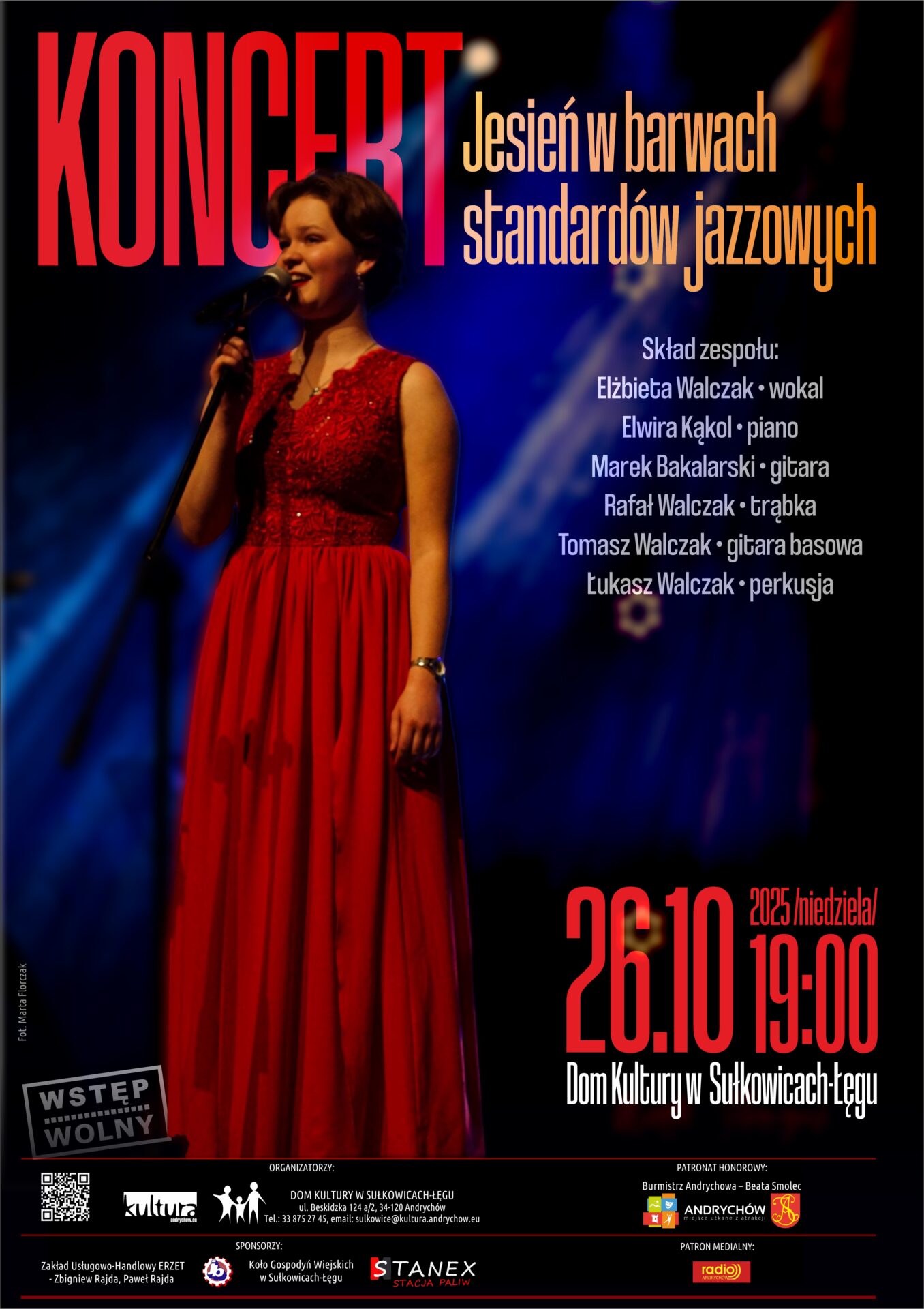 W niedzielę 26 października o godzinie 19.00 Dom Kultury w Sułkowicach-Łęgu wypełni się dźwiękami ponadczasowych jazzowych klasyków. W ramach koncertu „Jesień w barwach standardów jazzowych” na scenie wystąpi Elżbieta Walczak wraz z zespołem znakomitych instrumentalistów.