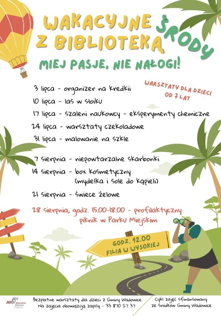 Wakacyjne zajęcia będą odbywać się w każdą środę pod hasłem „Miej pasje, nie nałogi” i będą prowadzone dwutorowo w budynku przy ul. Legionów 1 w Wadowicach oraz w filii Wadowickiej Biblioteki w Wysokiej. Dla dzieci i młodzieży przygotowano wiele zajęć podczas, których wykonywane będą m.in. las w słoiku, domki dla owadów, niepowtarzalne skarbonki, własne kosmetyki – mydełka i sole do kąpieli, świece żelowe, ozdobne breloczki czy piękne malowidła na szkle. Bibliotekę odwiedzą również „szaleni naukowcy”, więc nie zabraknie widowiskowych eksperymentów chemicznych.