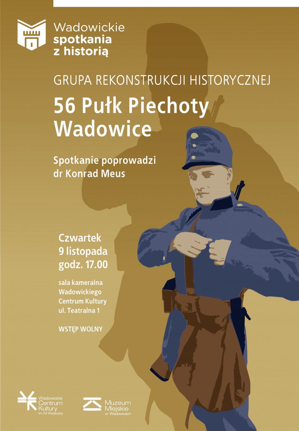 Już 9 listopada br. o godz. 17.00 zapraszamy do sali kameralnej Wadowickiego Centrum Kultury na spotkanie z Grupą Rekonstrukcji Historycznej 56 c.k. pułku piechoty. Spotkanie to zainauguruje nowy cykl pt.: „Wadowickie Spotkania z Historią”, którego pomysłodawcą jest dr Konrad Meus a organizatorem Muzeum Miejskie w Wadowicach.
