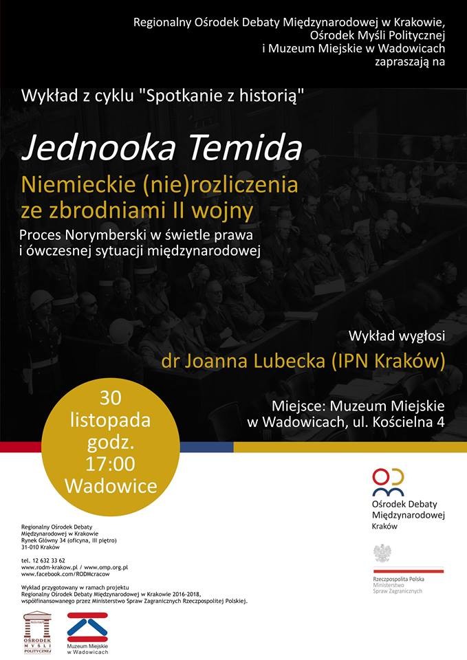 W ramach "Wadowickich Spotkan z Historią" zapraszamy 30 listopada (czwartek) o godz. 17:00 na wykład pt. "Jednooka Temida. Proces Norymberski w świetle prawa i ówczesnej sytuacji międzynarodowej. Niemieckie (nie)rozliczenia ze zbrodniami II wojny" wygłosi dr Joanna Lubecka, historyk, politolog, doktor nauk społecznych, wykładowca Akademii Ignatianum w Krakowie, ekspert Regionalnego Ośrodka Debaty Międzynarodowej, główny specjalista w Oddziałowym Biurze Badań Historycznych oddziału Instytutu Pamięci Narodowej w Krakowie.