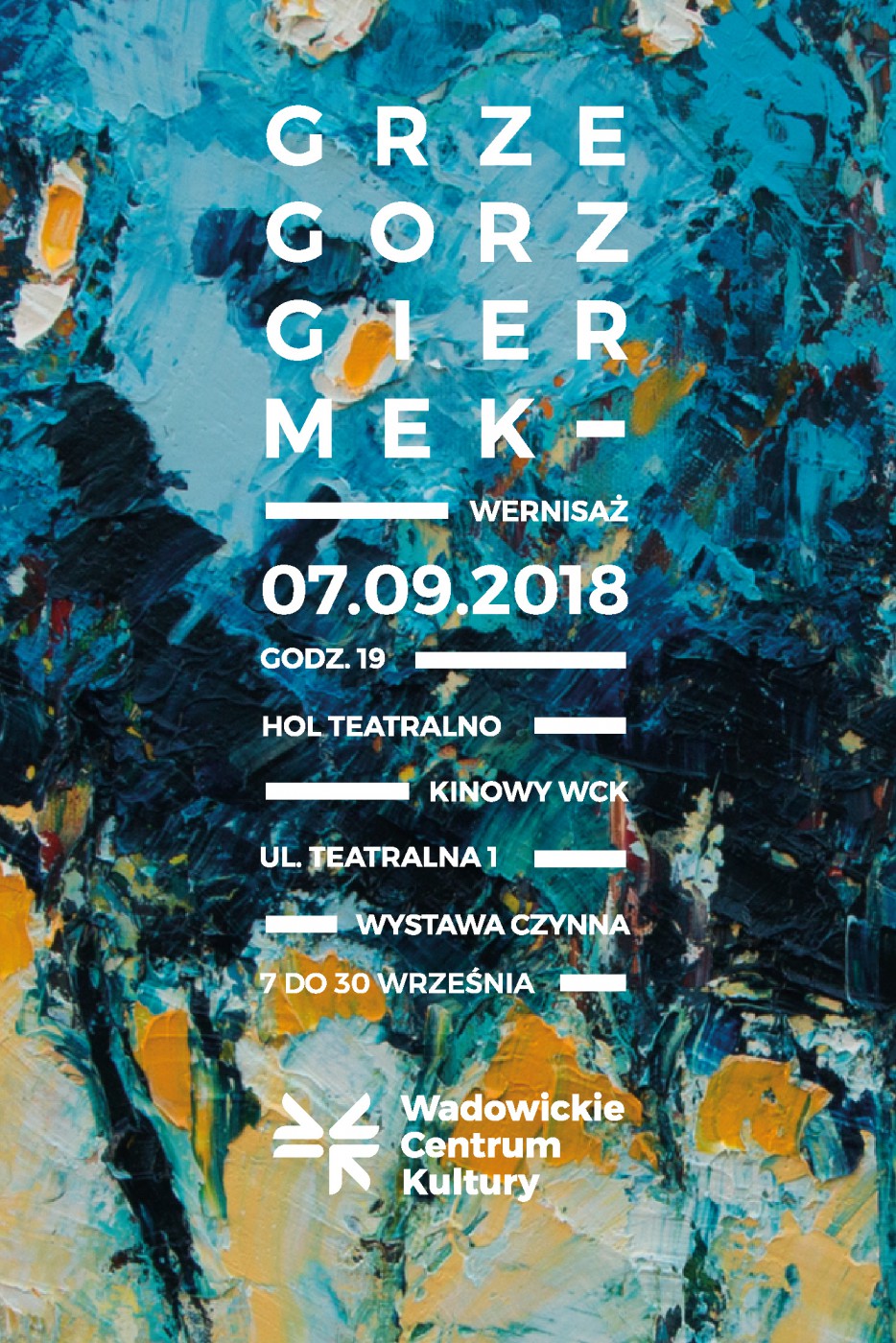 7 września (piątek) 2018 r. o godz. 19:00 w holu teatralno-kinowym Wadowickiego Centrum Kultury (ul. Teatralna 1) rozpocznie się wernisaż prac malarskich Grzegorza Giermka – artysty urodzonego w Wadowicach. Jego zakres twórczości oscyluje wokół malarstwa sztalugowego, grafiki, ikon i poezji. Członek grupy twórczej Nadskawie, powstałej z inicjatywy i pod patronatem Towarzystwa Miłośników Ziemi Wadowickiej. Współpracuje z galerią Bałysówka w Tomicach.