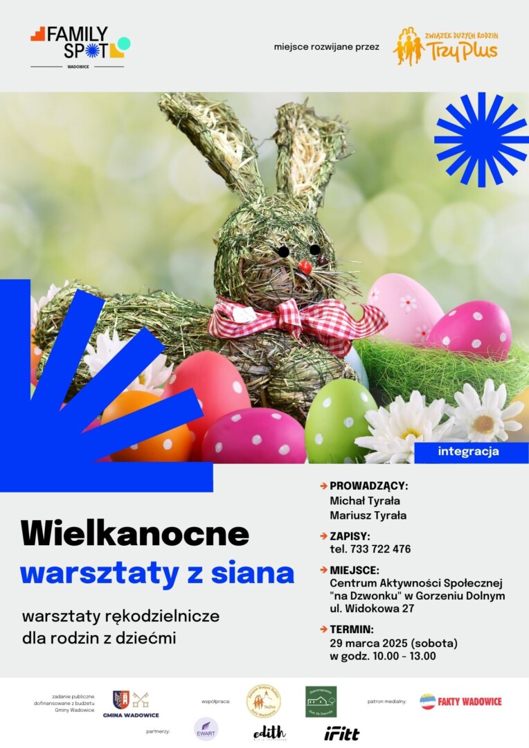 Zajęcia prowadzą Michał Tyrała i Mariusz Tyrała. Uczestnicy wspólnie zrobią zajączki z siana. Podczas spotkania Animator Rodzinny, Barbara Wawak chętnie odpowie na wszystkie pytania związane z projektem #FamilySpotWadowice oraz zapozna z działalnością Związku Dużych Rodzin 3 Plus, a także Wadowickiego Koła Związku Dużych Rodzin „Trzy Plus”
