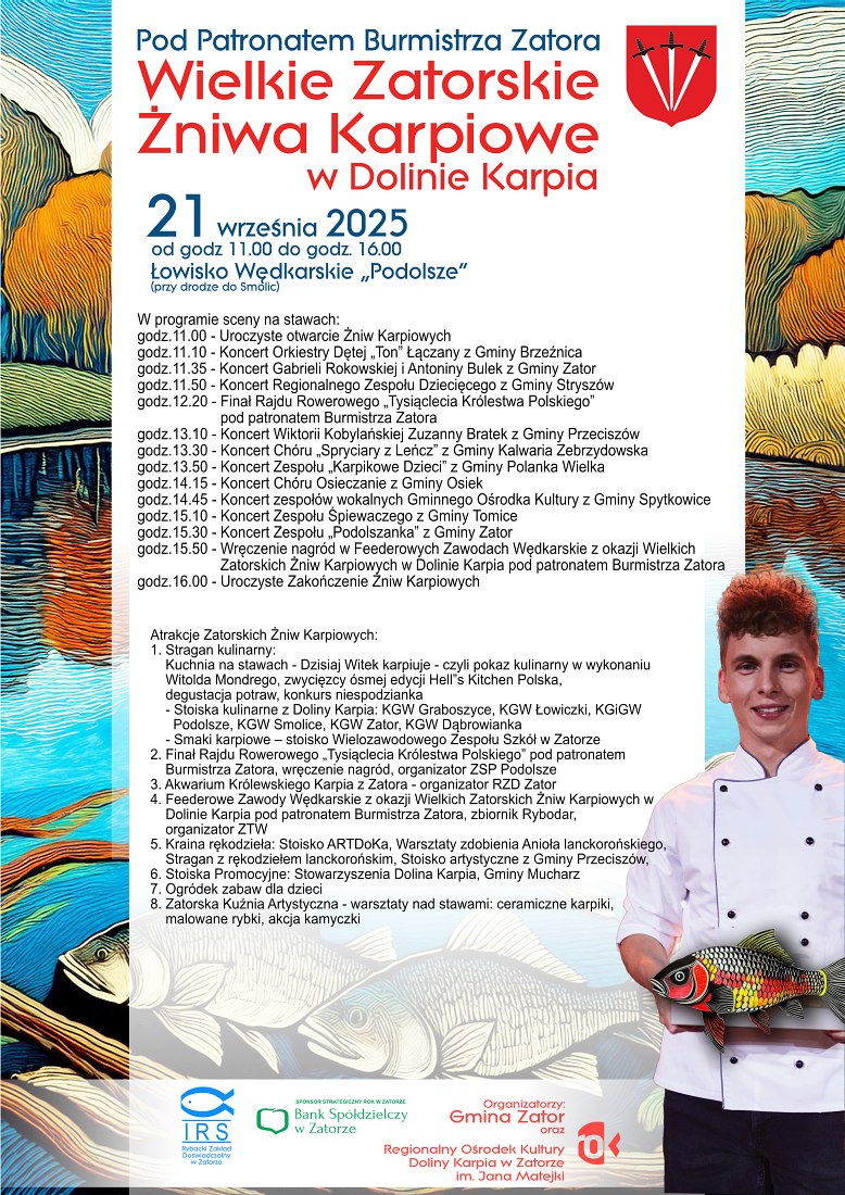 Regionalny Ośrodek Kultury w Zatorze zaprasza 21 września na Wielkie Zatorskie Żniwa Karpiowe. Spotkanie odbędzie się tradycyjnie na Łowisku Wędkarskim "Podolsze".