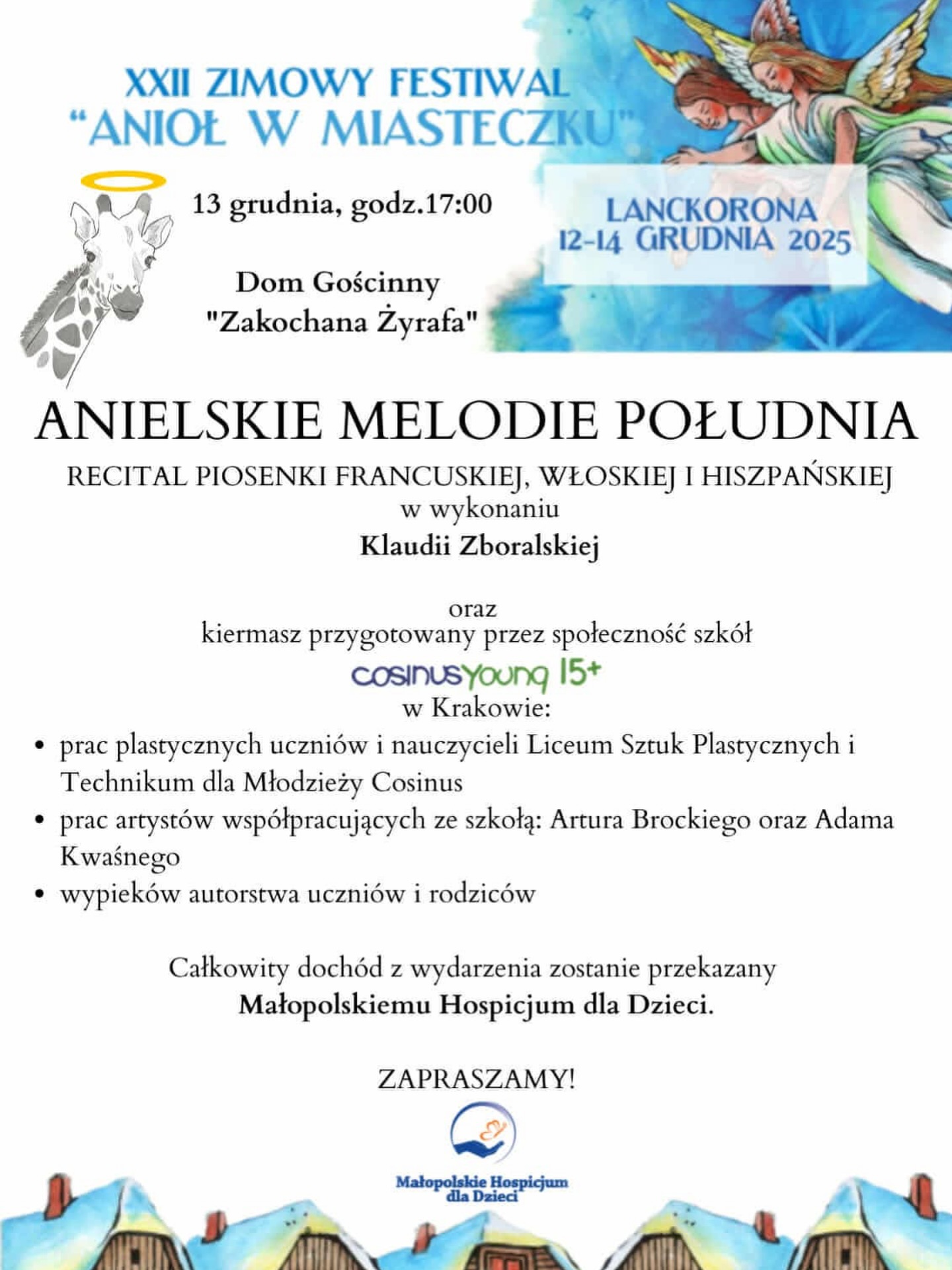 Dobro czyniące Anielskie Melodie Południa - 13 grudnia o godzinie 17.00 w nietuzinkowych wnętrzach Domu Gościnnego Zakochana Żyrafa w Lanckoronie odbędzie się niezwykłe wydarzenie przygotowane przez społeczność szkół CosinusYoung 15+ w Krakowie. W ramach XXII Zimowego Festiwalu „Anioł w Miasteczku”, jednego z najbardziej rozpoznawalnych grudniowych wydarzeń artystycznych w regionie, publiczność będzie miała okazję uczestniczyć w recitalu „Anielskie Melodie Południa”. Koncert w wykonaniu Klaudii Zboralskiej zabierze uczestników w muzyczną podróż po Francji, Włoszech i Hiszpanii, tworząc wieczór o wyjątkowej, ciepłej i świątecznej atmosferze. Cały dochód z wydarzenia zostanie przekazany na Małopolskie Hospicjum dla Dzieci.