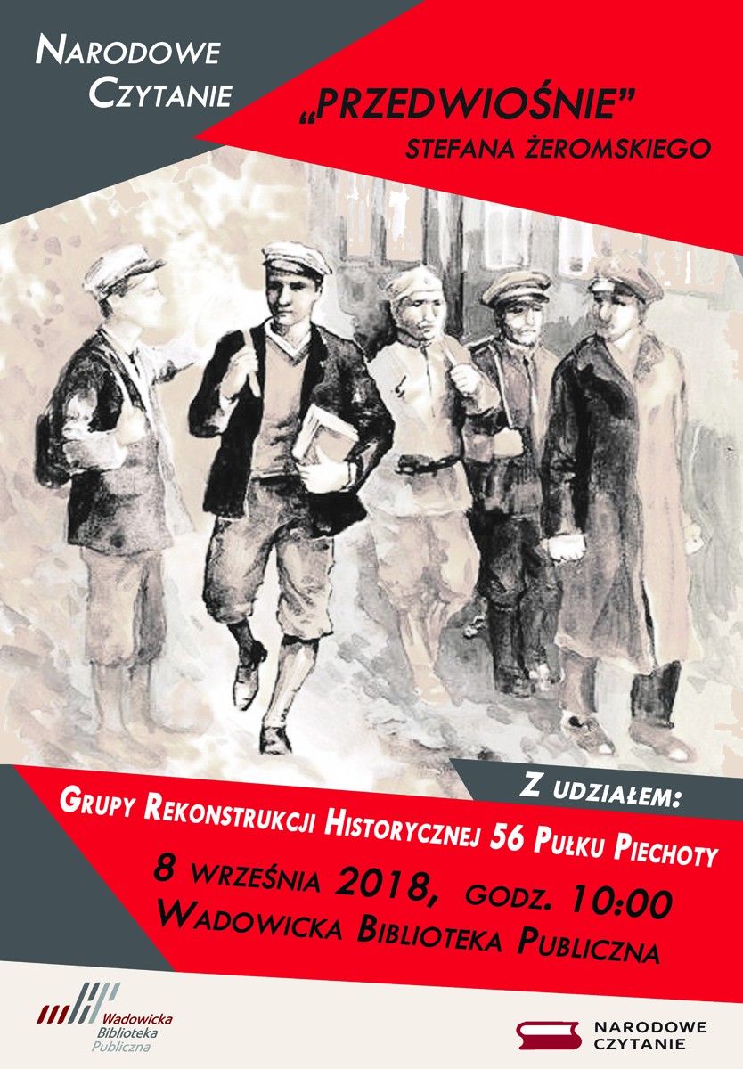 Wadowicka Biblioteka Publiczna (ul. Legionów 1) po raz kolejny zaprasza do wspólnego Narodowego Czytania! Tym razem w sobotę 8 września br. o godz. 10:00 czytane będą fragmenty „Przedwiośnia” oraz innych tekstów o tematyce niepodległościowej.