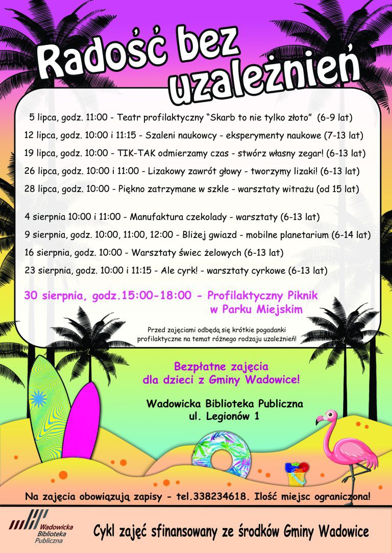 W tym roku w ramach wakacyjnych zajęć Wadowicka Biblioteka Publiczna realizuje projekt, mający na celu zachęcanie młodych ludzi do twórczego i kreatywnego spędzania czasu wolnego. „Radość bez uzależnień” to cykl cotygodniowych spotkań dla dzieci i młodzieży, które będą atrakcyjną alternatywą dla zagrożeń i uzależnień, czyhających na nich we współczesnym świecie.