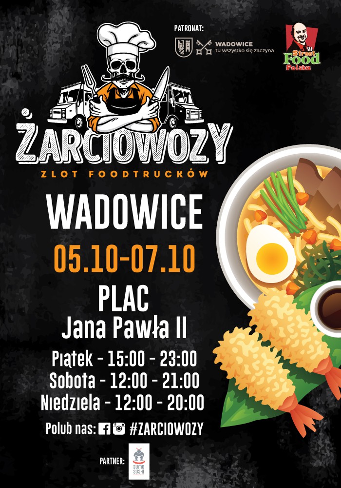 Od 5 do 7 października wadowicki rynek już po raz trzeci stanie się wielkim kulinarnym centrum wadowickiej społeczności, a wszystko dzięki kolejnej edycji Zlotu Żarciowozów, nad którym patronat objął Burmistrz Wadowic. ! Przed nami 3 dni pełne dobrego jedzenia, konkursów z nagrodami i wspaniałej atmosfery!