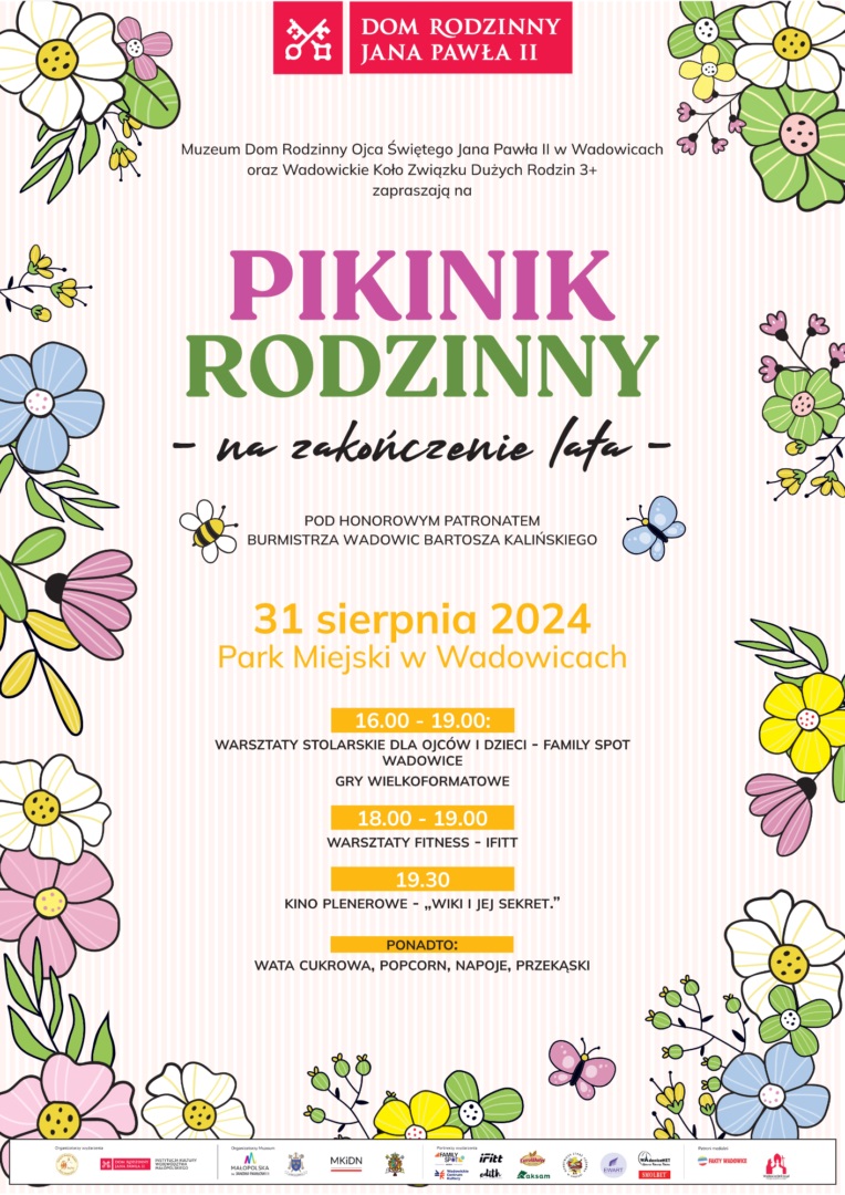 Zapraszamy na Piknik Rodzinny na zakończenie lata pod hasłem: „Rodziny, wy jesteście radością i nadzieją” pod Honorowym Patronatem Burmistrza Wadowic Bartosza Kalińskiego. Piknik ten zorganizowaliśmy we współpracy z Muzeum Dom Rodzinny Ojca Świętego Jana Pawła II, Wadowickim Kołem Związku Dużych Rodzin Trzy Plus, Wadowickim Centrum Kultury i iFitt Klubem Fitness.