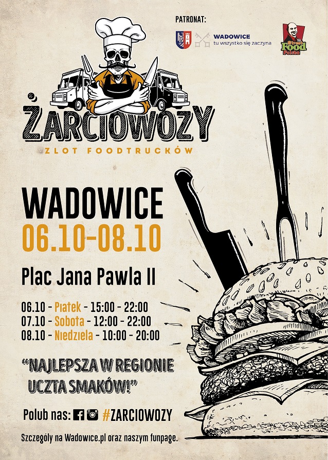 Zapraszamy wszystkich do udziału w I Zlocie Food Truck'ów, który odbędzie się na Wadowickim Rynku. "Żarciowozy" zaparkują już w piątek 6 października i będą serwować swoje specjały dla wszystkich do niedzieli 08.10.
