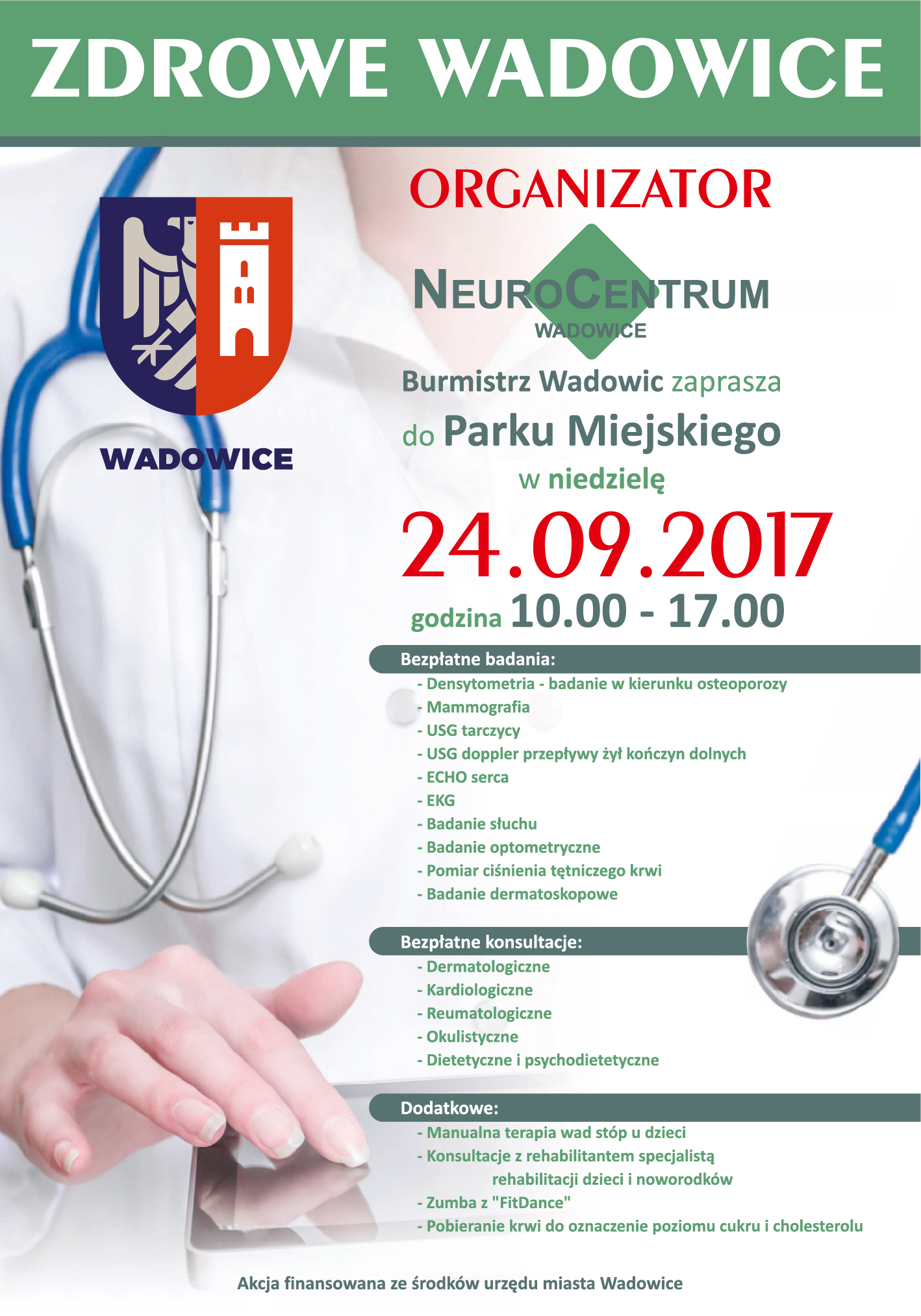Neuro Centrum Wadowice oraz Burmistrz Wadowiczapraszają do Parku Miejskiego przy al. Wolności 24 września (niedziela) 2017 r. w godzinach 10:00 - 17:00 na bezpłatne badania! Szczegóły na plakacie: