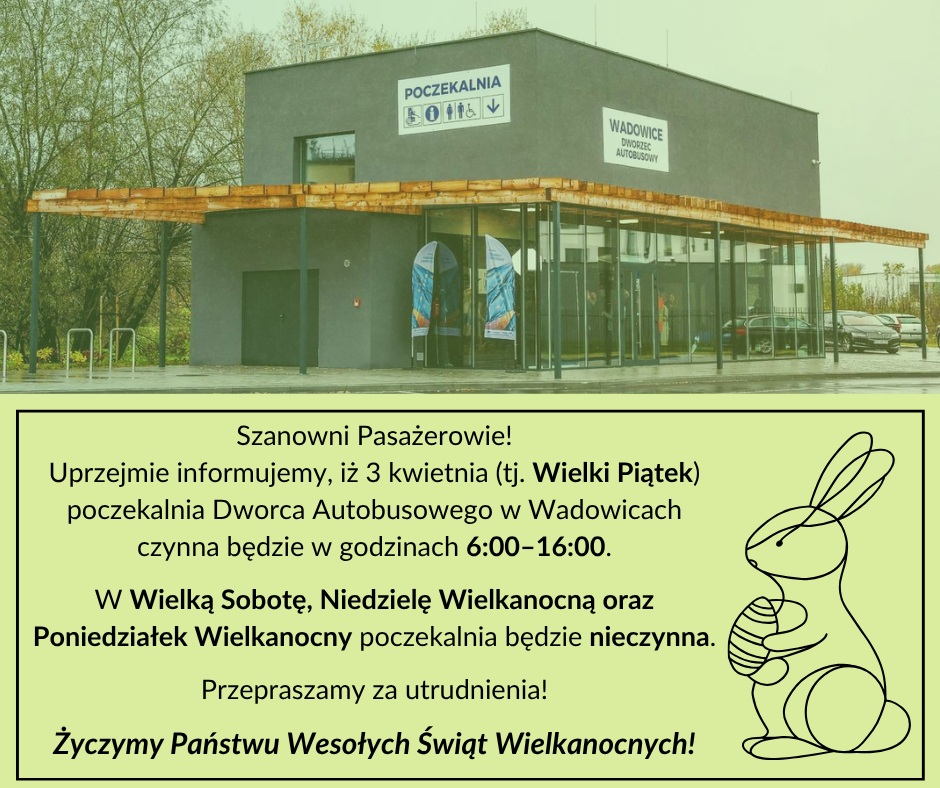 Poczekalnia Dworca Autobusowego w Wadowicach informujemy, że w związku ze zbliżającymi się Świętami Wielkanocnymi zmianie ulegną godziny funkcjonowania poczekalni w Wadowicach.