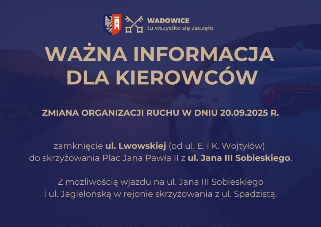 W związku z uroczystą Przysięgą wojskową, która odbędzie się 20 września 2025 r. na Rynku w Wadowicach, informujemy o czasowej zmianie organizacji ruchu drogowego.