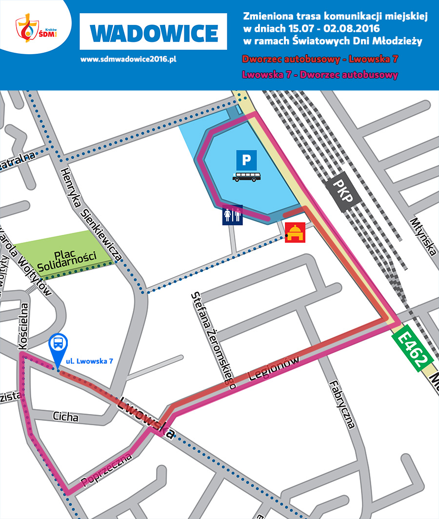 W ramach organizacji uroczystości obchodów Światowych Dni Młodzieży w Wadowicach zmianie ulega czasowo organizacja Dworca Autobusowego. Pomieszczenia poczekalni dla pasażerów zostaną zaadaptowane na potrzeby organizacji Centrum Informacyjno - Rejestracyjnego ŚDM.