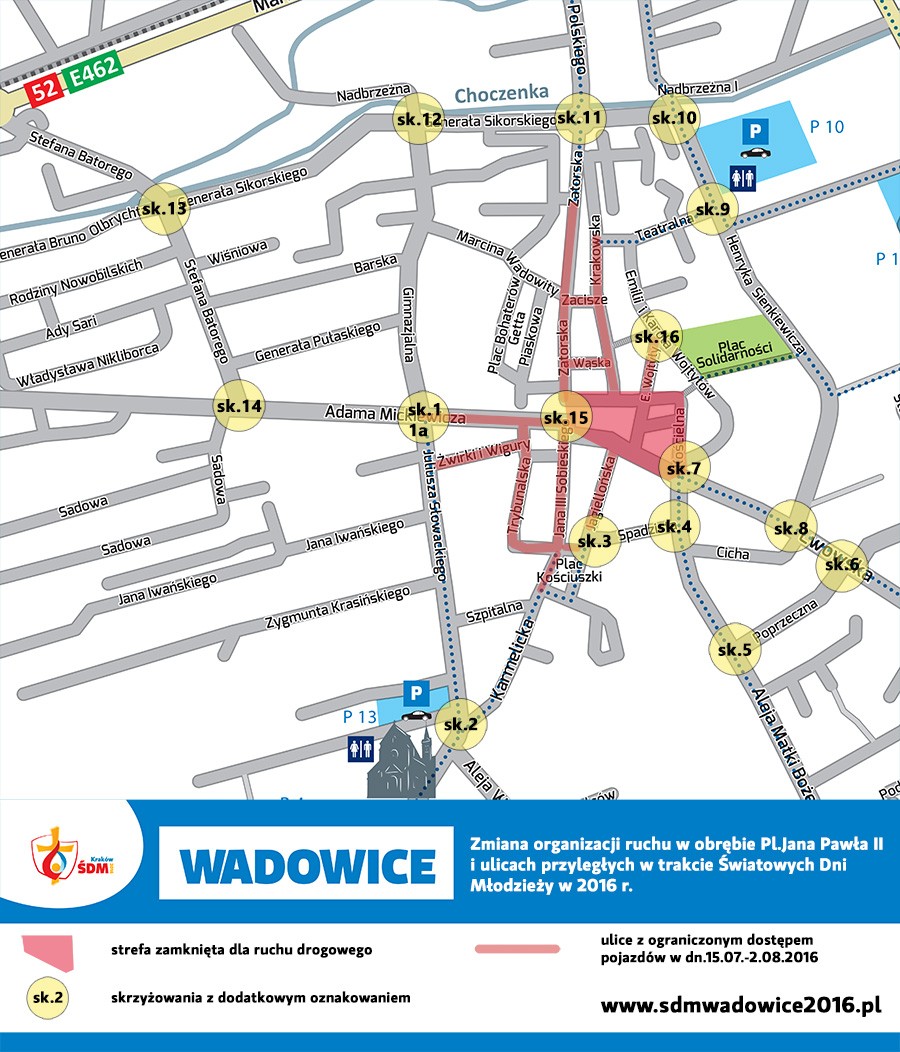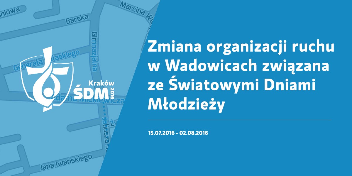 Urząd Miejski w Wadowicach informuje, iż w związku z organizacją na terenie Wadowic uroczystości związanych z obchodami Światowych Dni Młodzieży, w dniach 15.07 – 02.08.2016 r. zmianie ulega organizacja ruchu w centrum Wadowic.