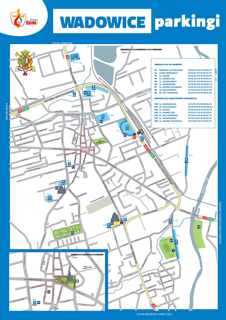 Mając na uwadze wzmożony ruch pojazdów w rejonie wyznaczonych miejsc postojowych jak również wyznaczone trasy komunikacji pieszej dla osób odwiedzających w tym czasie Wadowice prosimy o stosowanie się do wprowadzonej organizacji ruchu na terenie Wadowic.