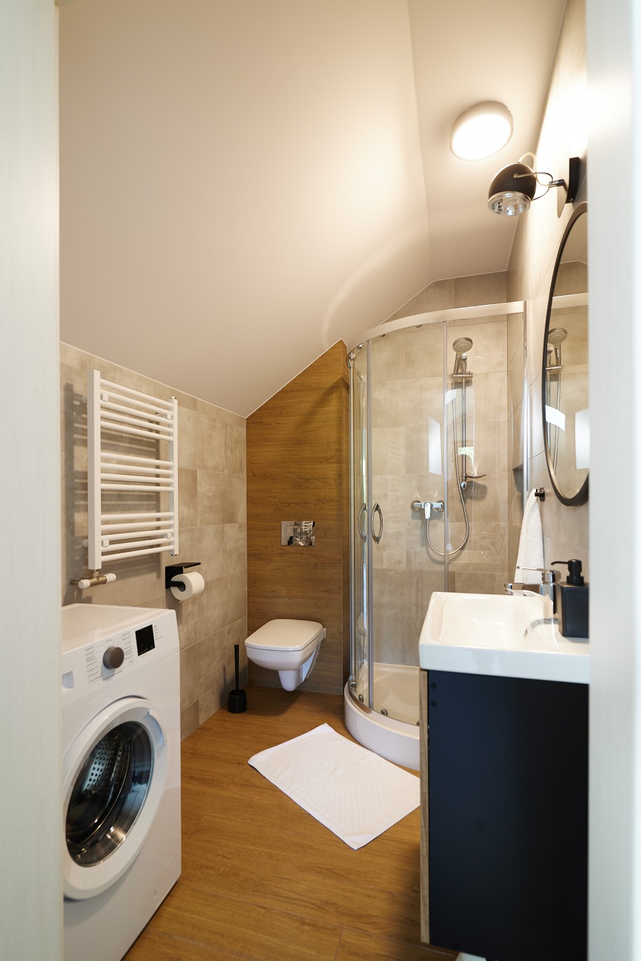 • pohodlná a svetlá kúpeľňa s veľkým zrkadlom, čistými uterákmi a sušičom vlasov, práčkou