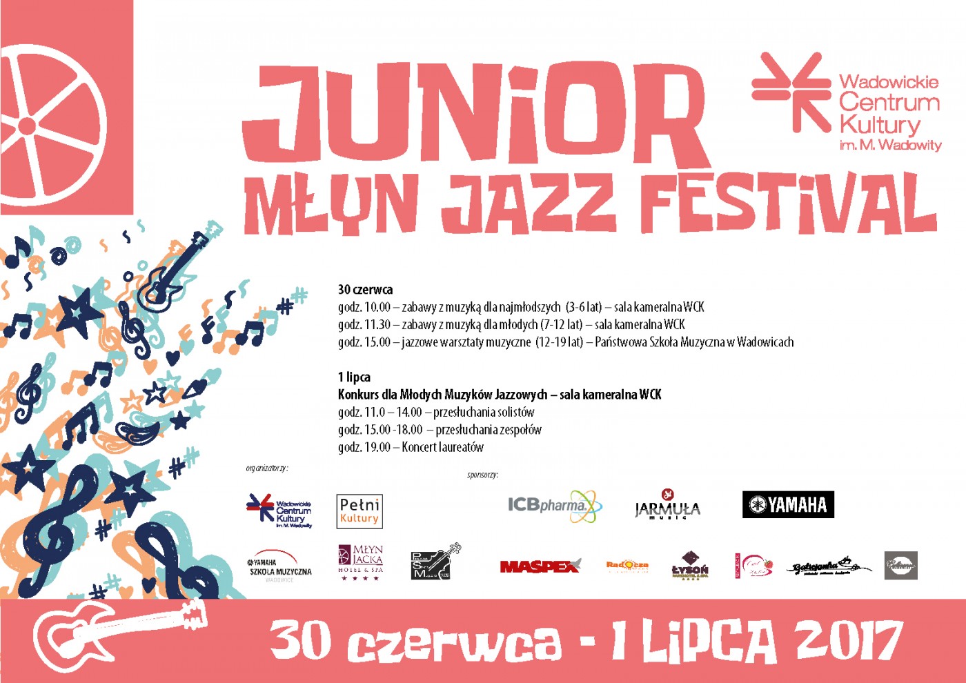 W piątek 30 czerwca zapraszamy do Wadowickiego Centrum Kultury najmłodszych na warsztaty umuzykalniające, podczas których dzieci także spróbują grać na różnych instrumentach. Po południu w sali wadowickiej szkoły muzycznej odbędą się warsztaty dla młodych muzyków, a poprowadzą je znani polscy jazzmani.