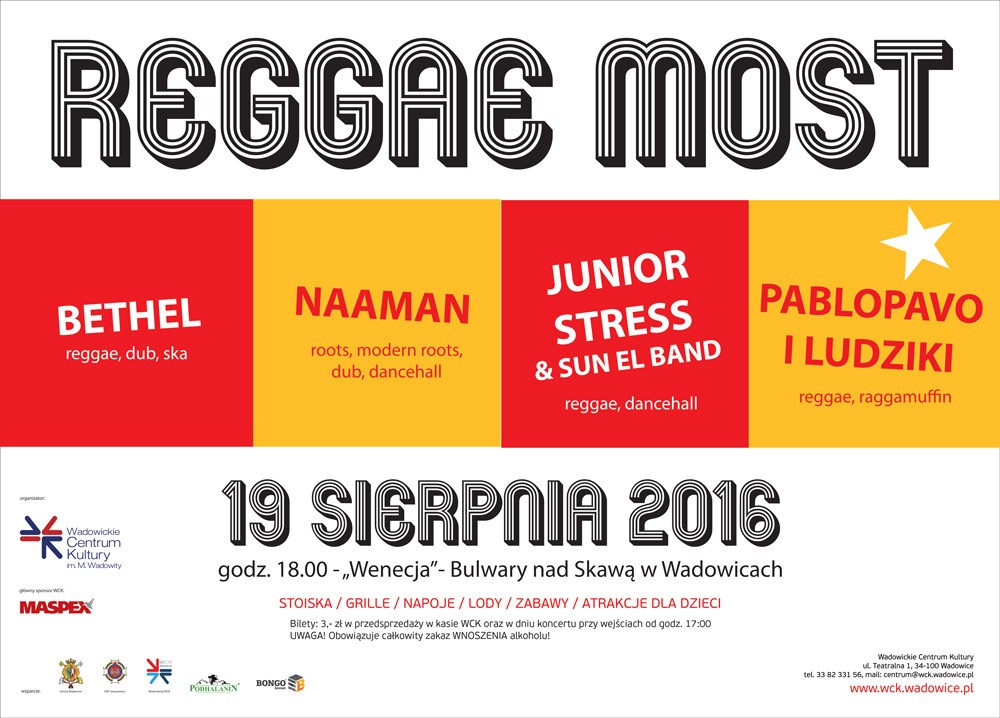 Zapraszamy wszystkich w przedostatni wakacyjny piątek (19 sierpnia 2016) nad rzekę na „Reggae Most 2016”! W tym roku na wadowickich bulwarach nad Skawą zagrają: „Bethel”, „Junior Stress” i „Naaman”. Na dokładkę ze specjalnie dla nas przygotowanym materiałem muzycznym reggae, sceną zawładnie "Pablopavo' i "Ludziki”!