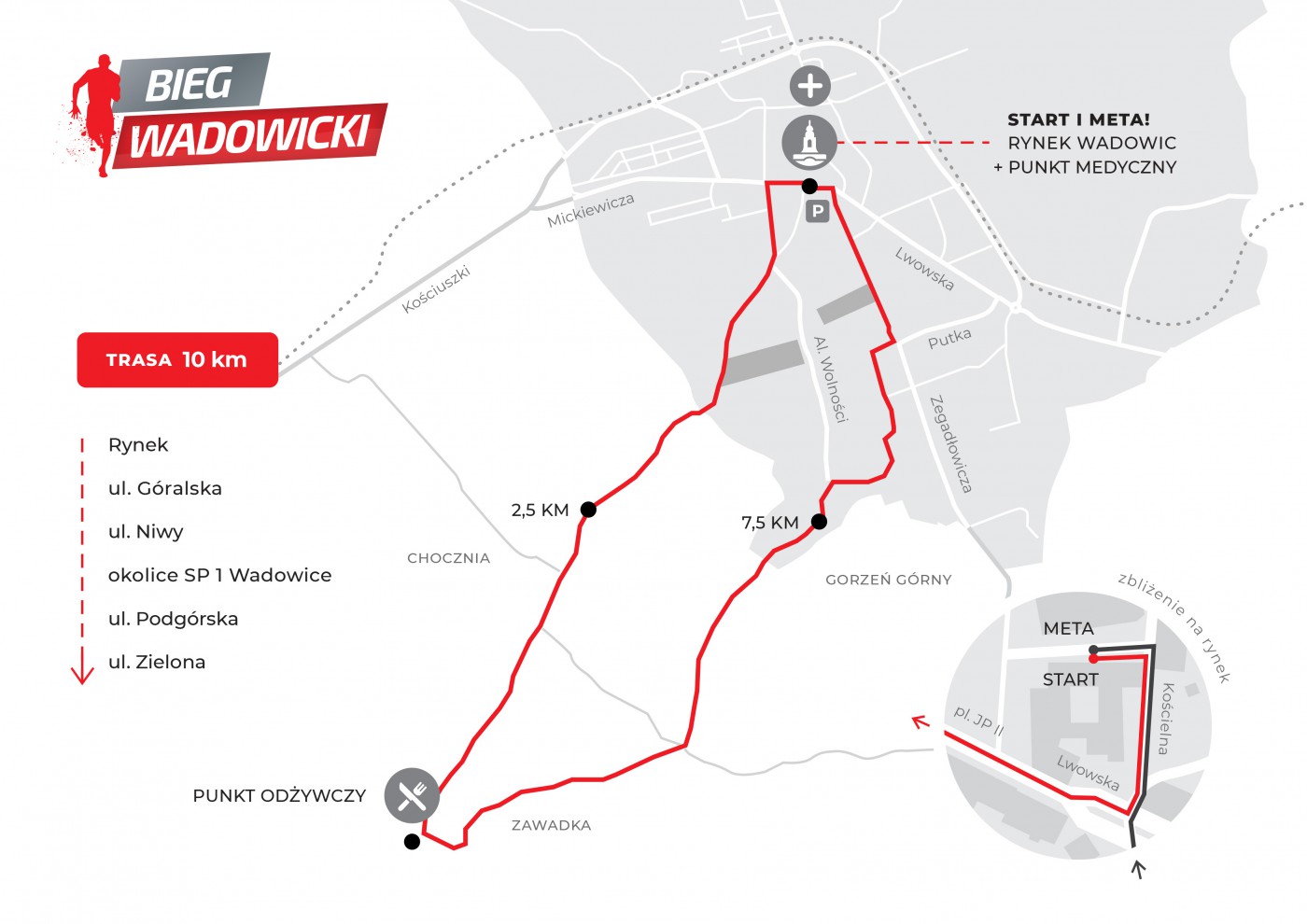 Bieg uliczny na dystansie 10 km obejmie w sumie przewyszeń około 330 m. Całość przebiega przez Wadowice oraz okolice po atestowanej, w pełni asfaltowej trasie.