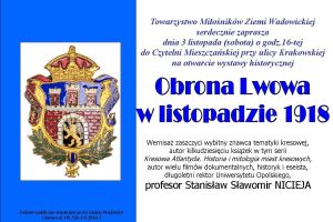 Towarzystwo Miłośników Ziemi Wadowickiej zaprasza 3 listopada br (sobota) na godz. 11:00 do budynku Czytelni Mieszczańskiej (ul. Krakowska 8) na konferencję historyczną pt. "Wadowic drogi do wolności" oraz otwarcie wystawy "Obrona Lwowa w listopadzie 1918". Program konferencji niepodległościowej będzie obejmował 3 tematy: 1. "Harcerstwo u progu Rzeczypospolitej", 2."Transporamacja ustrojowa w 1989", 3. "U progu Niepodległości". Ważnym punktem sobotniego spotkania przy ul. krakowskiej będzie również wernisaż wystawy, który zostanie otwarty przez wybitnego znawcę tematyki kresowej - prof. Stanisława Sławomira Nicieję - autora książek z serii "Kresowa Atlantyda. Historia i mitologia miast kresowych", autora filmów dokumentalnych, esejów.
