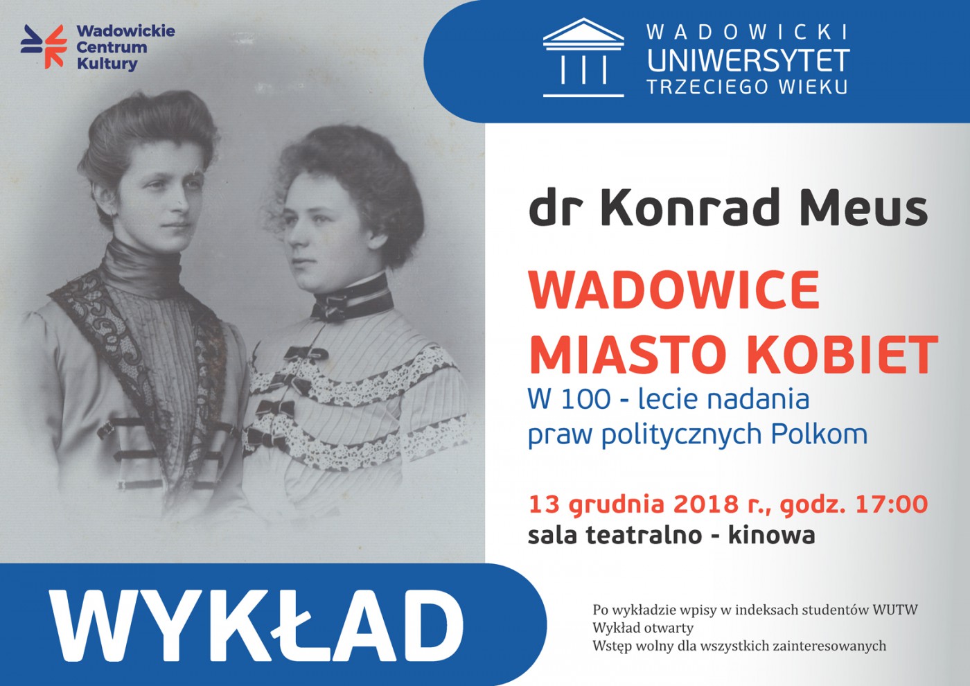 Wszystkich studentów Wadowickiego Uniwersytetu Trzeciego Wieku zapraszamy na kolejny wykład w ramach semestru zimowego. Gościem spotkania, będzie dr Konrad Meus, który już kilkakrotnie wygłaszał prelekcje dla naszych studentów. Temat grudniowego wykładu, ze względu na 100 rocznicę odzyskania niepodległości będzie dotyczył wadowickich kobiet na tle walki o wolność i swoje prawa. W tym miesiącu wykład WUTW wyjątkowo odbędzie się w sali teatralno – kinowej.