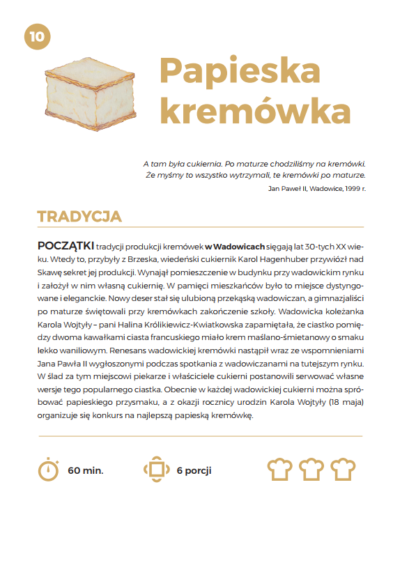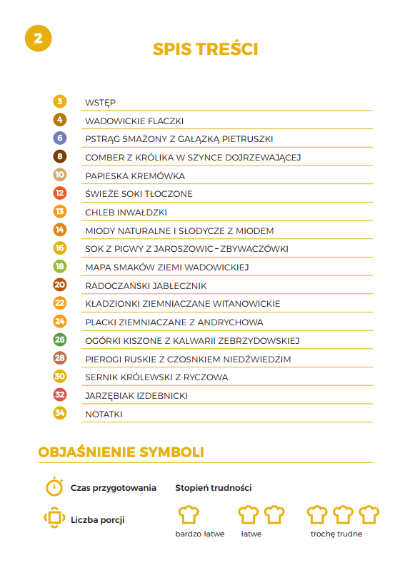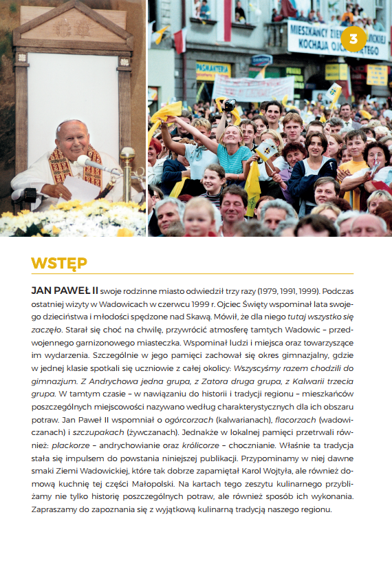 Publikacja ta powstała we współpracy z lokalnymi restauratorami i producentami, kołami gospodyń wiejskich, jak i mieszkańcami Ziemi Wadowickiej. Prezentujemy w niej specjały oparte na tradycji jak i nowoczesnych rozwiązaniach. Wśród nich znajdziemy wadowickie flaczki, comber z królika w szynce dojrzewającej, czy sok z pigwy z Jaroszowic – Zbywaczówki.